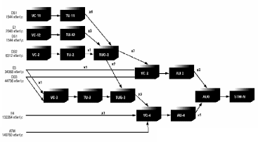 Полезные нагрузки могут быть упакованы в SDH несколькими способами, как показано на рисунке 4. Сигналы DS1 или E1 сначала упаковываются в виртуальный контейнер (VC-11, VC-12, соответственно). Этот виртуальный контейнер УС содержит полезную нагрузку и информацию заголовка. VC-11 или VC-12 затем упаковываются в более скоростной виртуальный контейнер VC, такой как VC-З, который может быть также использован для переноса сигналов DSЗ. Сигнал VC-З имеет дополнительную информацию заголовка. Более скоростной сигнал УС затем упаковывается в сигнал AU-З или AU-4, которые входят в состав STM-1.