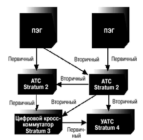 Генераторы размещаются в соответствии с иерархией, основанной на уровнях рабочих характеристик. ANSI назначает уровни рабочих характеристик как уровни слоев (Stratum): слои 1, 2, 3, 4Е и 4, в порядке от лучших к худшим. ITU (9) назначает 4 уровни рабочих характеристик: первичный эталонный генератор, транзитный узел, локальный узел, терминал или узел СРЕ. Слой 1 или ПЭГ являются управляющими узлами для сети. Слой 2 или генераторы транзитного узла обычно находятся в коммутационных устройствах и в некоторых видах цифрового кроссового оборудовании. Е третьему слою, или генераторам местных узлов относится большая часть местного коммутационного оборудования, цифровые кроссовые системы, некоторые учрежденческие АТС (РВХ) и мультиплексоры T1. Слой 4, или генераторы СРЕ, включают большую часть мультиплексоров T1, РВХ, банков каналов и эхоподавителей.