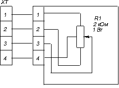 Командоаппарат потенциометрический КПМ11ФУ (рис. 2.12), маховичковый с асимметричной шкалой, однооборотный, встроен в панель пульта (утопленный). Маховичок может поворачиваться на угол от 0 до 350 градусов и фиксироваться в любом положении. В командоаппарате установлен потенциометр сопротивлением 2 кОм (рис.2.13.), предельная мощность рассеивания 1Вт, Uпит= 24В постоянного тока, Uвых=0...10В, Iвых=0...12мА. Для соединения с внешними цепями в командоаппарате предусмотрен клеммн