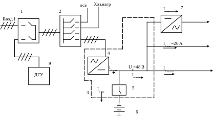 - шкаф вводно–распределительный с одним вводом городской сети и резервным вводом ДГУ. 2 - шкаф вводно–распределительный.3 – установка бесперебойного питания постоянного тока. 4 – модули выпрямителей. 5 – устройство коммутации и защиты аккумуляторных батарей. 6 - аккумуляторная батарея. 7 – инвертор напряжения. 9 – двигатель – генераторная установка.