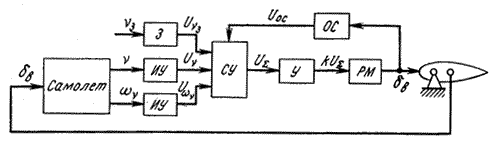 в — угол отклонения руля высоты; з— заданное значение угла тангажа; — угол тангажа; 3 — задатчик угла тангажа; ИУ — измерительные устройства (датчики и ); Uз, U, U— напряжения, пропорциональные значениям з, , ; СУ — суммирующее устройство; Uос — напряжение обратной связи; U— суммарное напряжение; У — усилитель; ОС — датчик обратной связи; k — коэффициент усиления усилителя; РМ — рулевая машина