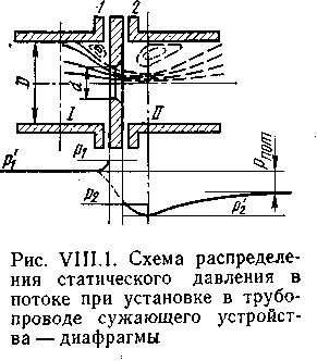 Из рис. VIII.1 видно, что давление по оси трубопровода, показанное штрихпунктирной линией, несколько отличается от давления вдоль стенки трубопровода только в средней части графика. Через отверстия 1 и 2 производится измерение статических давлений до и после сужающего устройства.
