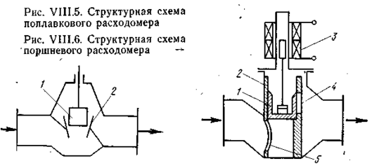 В поршневом расходомере (рис. VIII.6) чувствительным элементом является поршень /, перемещающийся внутри втулки 2.