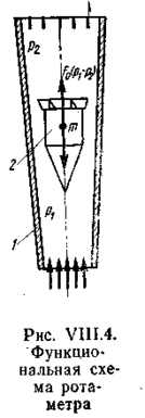 асходомеры постоянного перепада давления — ротаметры — применяются для измерения расходов однородных потоков чистых и слабозагрязненных жидкостей и газов, протекающих ..... по трубопроводам и не подверженных значительным колебаниям. Особенно широко они используются в винодельческом, спиртовом, ликерно-водочном и других производствах. Ротаметр (рис. VIII.4) представляет собой длинную коническую трубку 1, располагаемую вертикально, вдоль которой под действием движущегося снизу вверх потока перемещается поплавок 2. Поплавок перемещается до тех пор, пока площадь кольцевого отверстия между поплавком и внутренней поверхностью конусной трубки не достигнет такого размера', 'при котором перепад давления по обе стороны поплавка не станет равным расчетному. При этом действующие на поплавок силы уравновешиваются, а поплавок устанавливается на высоте, соответствующей определенному.значению расхода.