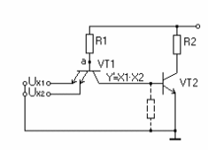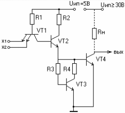 Если на один из входов подать уровень напряжения, соответствующим логическому «0», то через переход (б-э)VT1 ток протечет по цепи: «+»ИП ® R1 ® (б-э)VT2 ® X1 ® корпус