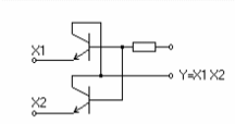 Если на x1 и x2 подана “1”, то б–э смещены в обратном направлении, R велико, а б–к смещен в прямом направлении (R мало).