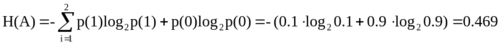 , или усреднение по всему ансамблю сообщений. Рассчитаем энтропию заданного источника Рассчитаем значение энтропии для случая, когда количество сообщений К = 2, а вероятности этих сообщений распределены следующим образом: р(1)=0.1, р(0)=0.9, тогда