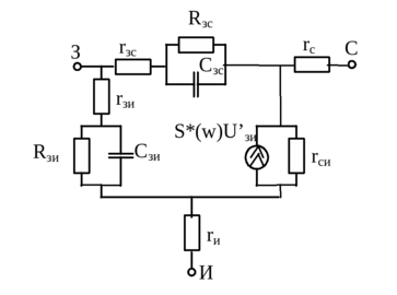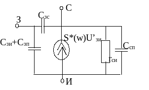 Крутизна по затвору в этой схеме предполагается не зависящей от частоты. Кроме того, в схеме отсутствует сопротивление участка «подложкасток» (Rпс), но оно так велико по сравнению с сопротивлением канала (rси), что с его шунтирующим действием можно не считаться.