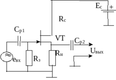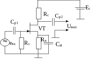 Рис. 3.14. Схема усилительного каскада на полевом транзисторе с ОИ