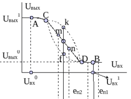 В усилительных каскадах используется участок характеристики между точками СD. Следовательно, входные и выходные сигналы могут принимать любые значения в пределах этого отрезка характеристики. Учитывая возможную деформацию характеристики, делаем вывод о том, что усилительные каскады (аналоговые схемы) очень чувствительны к разного рода помехам, к разбросу параметров, к температурному дрейфу, временному дрейфу.