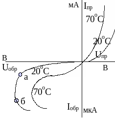 На рис. 1.1 прямая ветвь характеристики, снятая при 70 оС, сместилась влево: с повышением температуры вступает в силу собственная проводимость полупроводника, число носителей увеличивается, так как усиливается процесс термогенерации. Обратная же ветвь ВАХ (рис. 1.1) смещается вправо, то есть с повышением температуры до +70 оС электрический пробой в переходе наступает раньше, чем при температуре +20 оС. При увеличении обратного напряжения к тепловому току добавляется ток термогенерации. В сумме эти два тока образуют через обратносмещенный переход обратный ток Iобр. При изменении температуры новое значение обратного тока можно оп-