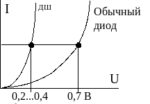 Рис. 1.7. ВАХ диода Шоттки (ДШ) и обычного диода