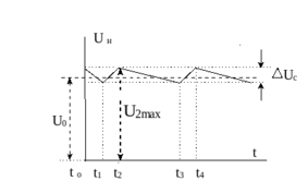 Отрезок времени, на котором происходит разряд конденсатора, оказывается близким к половине периода входного напряжения выпрямителя.