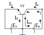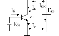 Схемы включения транзистора с ОЭ и с ОК (рис. 2.4, б, в) это схемы с базовым управлением: выходной ток следует за всеми изменениями входного базового тока. В схеме с ОЭ выходным током является ток коллектора, а в схеме с ОК ток эмиттера. Во всех схемах включения (ОБ, ОЭ, ОК) источники постоянного напряжения обеспечивают режимы работы транзисторов по постоянному току , то есть необходимые начальные значения напряжений и токов. При отсутствии на входе источников переменного сигнала режим, в котором находится транзистор, принято называть режимом покоя, а токи и напряжения параметрами покоя ( токи покоя, напряжения покоя).