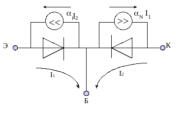 где: I1 ток, инжектируемый в базу из эмиттера; I2 ток, инжектируемый в базу из коллектора; Iэо, Iко тепловые токи (именно тепловые, а не обратные токи переходов, которые в случае кремния намного превышают тепловые. На практике тепловые токи каждого перехода принято измерять, обрывая цепь второго перехода).