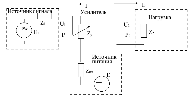 Устройство, к которому подводят усиленные колебания, называется нагрузкой, а цепь усилителя, к которой подключают эту нагрузку, выходом. Устройство, от которого усилитель получает энергию, преобразуемую им в усиленные электрические колебания, называют источником питания (обычно используют источник постоянного напряжения, а исключение составляют параметрические усилители).