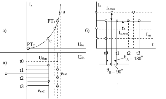 б временные диаграммы коллекторного тока для режимов кл. «А» и кл. «В»; в временные диаграммы входного напряжения при разных положениях РТ