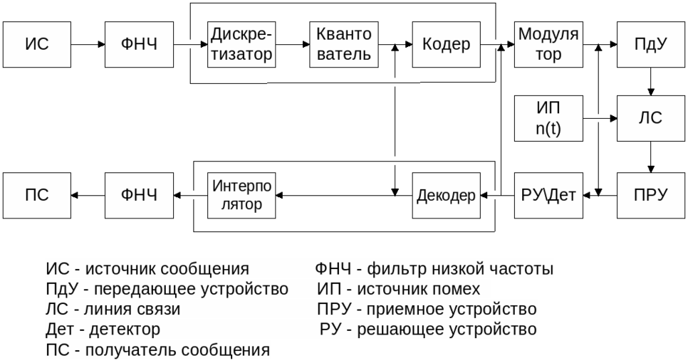 Далее НЧ-сигнал поступает на дискретизатор, к которому подводятся стробирующие импульсы, что позволяет выделить дискретные отсчеты в определенные моменты времени. Для опознавания переданных двоичных символов на выход дискретизатора подключается решающее устройство, на выходе которого присутствует принятая кодовая комбинация.