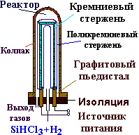 на поверхности разогретых кремниевых стержней — основах диаметром 4—8 мм (иногда до 30 мм), получаемых методом выращивания с пьедестала. В некоторых технологиях вместо цилиндрических стержней используются пластинчатые (толщиной 1—5 мм и шириной 30—100 мм) с большей площадью осаждения. Материалом для выращивания стержней служит высококачественный поликристаллический кремний. Поверхность стержней – основ подвергают ультразвуковой очистке, травлению в смеси кислот (например, HF+ + HNO3), отмывке и сушке. К стержням – основам для получения высококачественного поликристаллического кремния предъявляются высокие требования по чистоте: они должны иметь удельное сопротивление по донорам >700 Ом·см и по бору >5000 Ом·см.