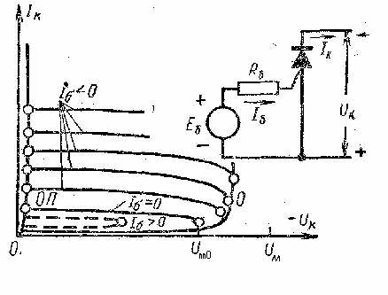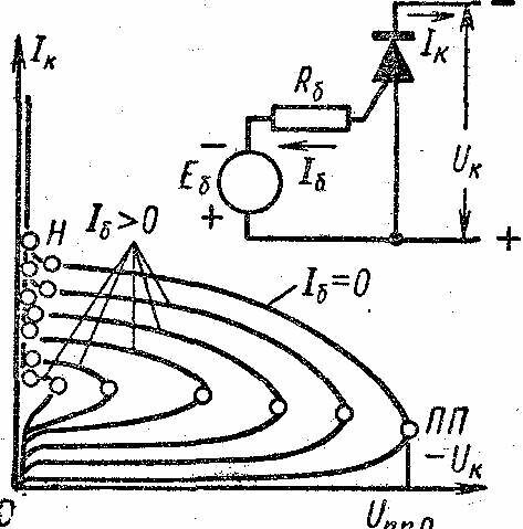 Координаты точек прямого переключения определяются, как и в динисторе, условием dUk/dIk, == 0. Анализ показывает, что ток Iп.п возрастает с увеличением тока базы.
