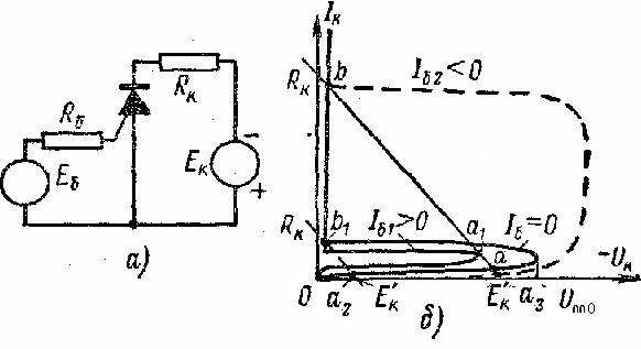 В первом случае рабочая точка скачком переходит из положения b1 в положение a2, а затем (после восстановления Э. Д. С. Ek) - в исходную точку а. Во втором случае из точки b происходит скачок в точку a3, а затем (по окончании запирающего импульса) возвращение в точку а. Первый путь известен из тиратронной техники, второй специфичен для тринистора, так как тиратрон нельзя погасить со стороны сетки. Правда, базовый ток «гашения» в тринисторе оказывается сравнительно большим из-за малого коэффициента усиления при выключении.