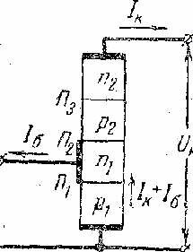 где 3 - коэффициент передачи тока от перехода П3 к переходу П2. Реальное запирающее смещение на эмиттерном переходе будет меньше, чем э. д. с. Eб, на величину Ik Rб. С ростом тока Ik смещение будет уменьшаться, и при некотором токе I0, когда Eб - I0Rб = 0, эмиттерный переход отопрется. После этого базовый ток будет иметь неизменную отрицательную величину: