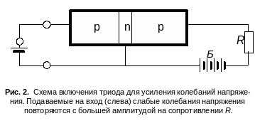 -переходе очень мал, то после появления напряжения на зажимах а и б этот ток поч-ти так же велик, как прямой ток в левом переходе. Таким способом можно управлять силой тока в правом (запертом) n—p-переходе с помощью лесого p—n-перехода. Запирая левый переход, мы прекращаем ток через правый переход; открывая ле-вый переход, получаем ток в правом переходе. Изменяя величину прямого напря-жения на левом переходе, мы будем изменять тем самым силу тока в правом пе-реходе. На этом и основано применение p—n—p-триода в качестве усилителя.