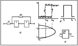 Этот триггер (рис. 13,a) стоит особняком в семействе триггеров: он имеет один вход, один выход и не обладает свойствами запоминающего элемента. Триггер содержит два инвертора, охваченных положительной обратной связью, за счет чего выход схемы может изменять свое состояние лавинообразно.На выходе инвертора потенциал с лог. 0 на лог. 1 изменяется при большем входном напряжении, чем при изменении с лог.1 на лог. 0. Поэтому схема (рис.13,а) обладает гистерезисом (рис. 13,б). Это позволяет использовать ее в качестве формирователя прямоугольных импульсов из входного напряжения, в частности, из синусоидального.