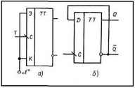 Счетный триггер просто реализуется и на D-триггере (рис. 12, б). Если после каждого переключения обеспечить автоматическую смену уровня потенциала на D-входе, то с каждым импульсом на C-входе триггер будет менять свое состояние. Указанная смена потенциала будет осуществляться, если D-вход соединить с выходом
