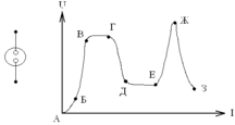 - ЕЖ – участок анормального тлеющего разряда, весь катод покрыт тлеющим разрядом, рабочий участок;