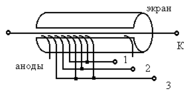 1 – электрод подготовительного разряда, вызывает тлеющий разряд, но не на катоде, служит для начальной ионизации газа.