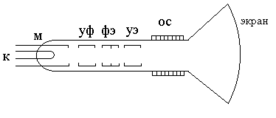 – модулятор, на него подается положительное напряжение, через модулятор пройдут только те электроны, которые летят с нужным вектором скорости, модулятор служит также для регулировки яркости.