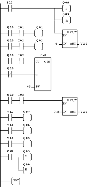 Тележка перемещается по рельсам от одного склада к другому. Тележка за один цикл должна съездить 5 раз туда – обратно и остановится. Запускается цикл с помощью кнопки без фиксации. Конечники имитируются любыми двумя кнопками. Время стоянки на усмотрение программиста. Самый простой вариант с нулевым временем стоянки. Три светодиода должны индицировать текущее количество сделанных перемещений туда – обратно. По окончании цикла должен гореть только один светодиод, который не горит во время выполнения цикла.