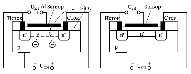 | Рисунок 4.4 Структура МДП ПТ с индуцированным (а) и встроенным (б) каналами. | |