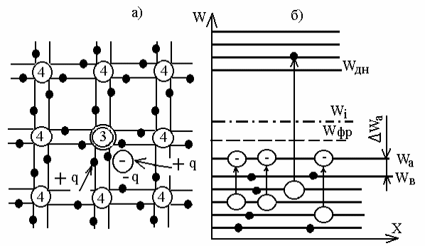 Рисунок 1.5 Условное изображение кристаллической решетки (а) и энергетическая диаграмма (б) полупроводника с дырочной электропроводностью.