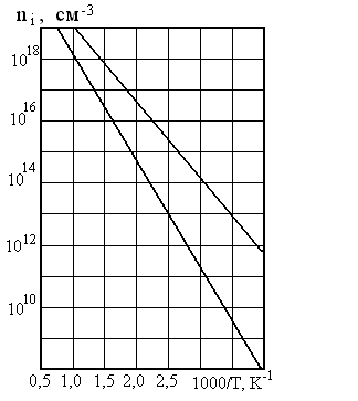 Из выражения (1.2) следует, что в чистом полупроводнике концентрации носителей зарядов зависят от ширины запрещенной зоны и при увеличении температуры возрастают приблизи -тельно по экспоненциальному закону (температурные изменения А играют незначительную роль). (Рисунок 1.3) Равенство концентраций ni и pi показывает, что такой полупроводник обладает одинаковыми электронной и дырочной электропроводностями и называется полупроводником с Рисунок 1.3 Зависимость концентрации собственной электропроводностью.