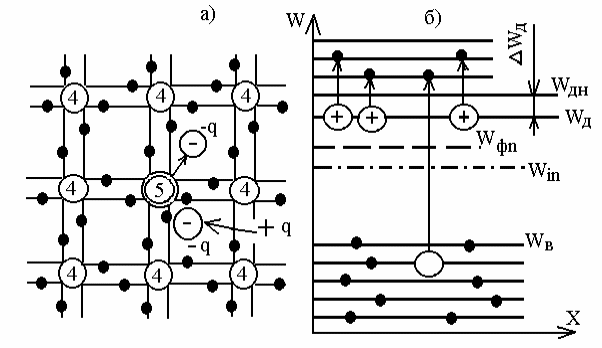 Рисунок 1.4 Условное обозначение кристаллической решетки (а) и энергетическая диаграмма (б) полупроводника с электронной электропроводностью.