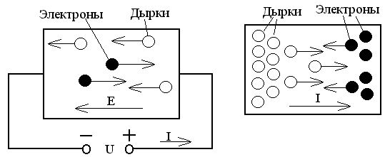 В полупроводниках свободные электроны и дырки находятся в состоянии хаотического движения. Поэтому, если выбрать произвольное сечение внутри объема полупроводника и подсчитать число носителей заряда, проходящих через это сечение за единицу времени слева направо и справа налево, значения этих чисел окажутся одинаковыми. Это означает, что электрический ток в данном объеме полупроводника отсутствует.