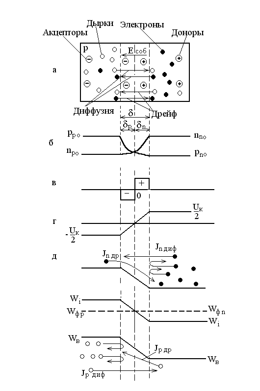 дырки n-области, совершая тепловое движение, попадают в пределы диффузионного электрического поля, увлекаются им и перебрасываются в противоположные области, образуя ток дрейфа, или ток проводимости.