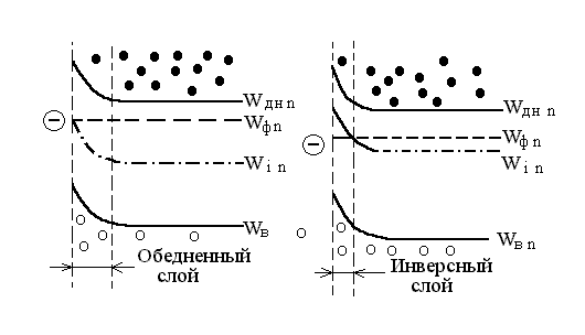 Обеднение возникает в том случае, если поверхностный заряд совпадает по знаку с основными носителями заряда. На рис. 1.20 показано образование обедненного слоя на поверхности полупроводника n-типа при такой плотности поверхностных состояний, что уровни Win и Wфn не пересекаются. Повышение плотности пространственного заряда может привести к пересечению уровня Ферми с уровнем середины запрещенной зоны (рис. 1.21), что соответствует изменению типа электропроводности у поверхности полупроводника. Это явление называют инверсией типа электропроводности, а слой, в котором. оно наблюдается, - инверсным слоем.