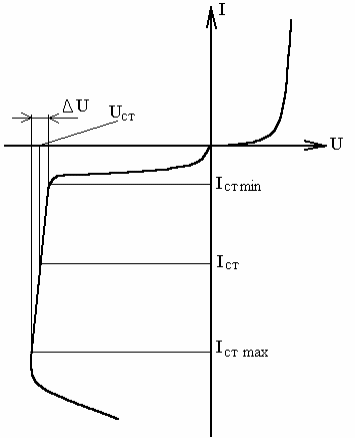 Стабилитроном называется полупроводниковый диод, на обратной ветви ВАХ которого имеется участок с сильной зависимостью тока от напряжения (рисунок 2.2), т.е. с большим значением крутизны I/U (I= Icт max - Iст min). Если такой участок соответствует прямой ветви ВАХ, то прибор называется стабистором.