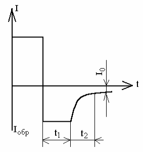 Разновидностью импульсных диодов являются диоды с накоплением заряда (ДНЗ) или диоды с резким восстановлением обратного тока (сопротивления). Импульс обратного тока в этих диодах имеет почти прямоугольную форму (рисунок 4.2). При этом значение t1 может быть значительным, но t2 должно быть чрезвычайно малым для использования ДНЗ в быстродействующих импульсных устройствах.