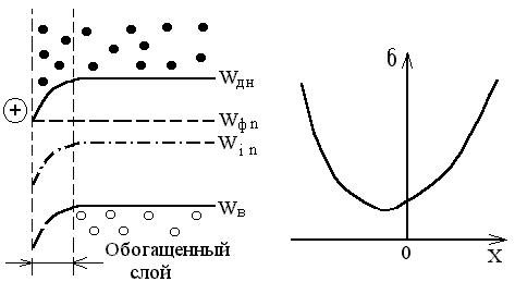 Если знаки поверхностного заряда и основных носителей противоположны, происходит обогащение приповерхностной области основными носителями зарядов. Такую область называют обогащенным слоем (рис. 1.22).