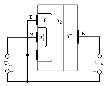 Структура реального транзистора типа n-p-n изображена на рисунке 3.2. В этой структуре существуют два перехода с неодинаковой площадью: площадь левого перехода n1+-p меньше, чем у перехода n2-p. Кроме того, у большинства БТ одна из крайних областей (n1 с меньшей площадью) сечения легирована гораздо сильнее, чем другая крайняя область (n2).