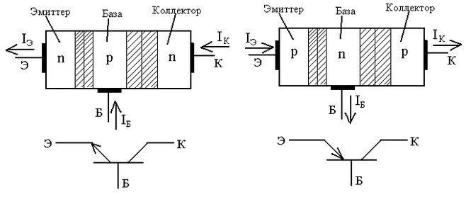 n-p-n (или со структурой n-p-n) и типа p-n-p (или со структурой p-n-p), условные изображения которых показаны на рисунке 3.1.