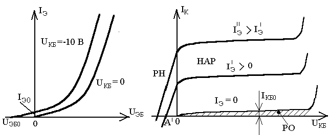 При UКБ = 0 характеристика подобна ВАХ p-n-перехода. С ростом обратного напряжения UКБ (UКБ < 0 для p-n-p-транзистора) вследствие уменьшения ширины базовой области (эффект Эрли) происходит смещение характеристики вверх: IЭ растет при выбранном значении UЭБ. Если поддерживается постоянным ток эмиттера (IЭ = const), т.е. градиент концентрации дырок в базовой области остается прежним, то необходимо понизить напряжение UЭБ, (характеристика сдвигается влево). Следует заметить, что при UКБ < 0 и UЭБ = 0 существует небольшой ток эмиттера IЭ0, который становится равным нулю только при некотором обратном напряжении UЭБ0.