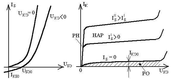 прямое включение эмиттерного перехода, так как UЭБ = -UБЭ > 0. Если при этом UКЭ = 0 (потенциалы коллектора и эмиттера одинаковы), то и коллекторный переход будет включен в прямом направлении: UКБ = UКЭ + UЭБ = UЭБ > 0. Поэтому входная характеристика при UКЭ = 0 будет соответствовать режиму насыщения (РН), а ток базы равным сумме базовых токов из-за одновременной инжекции дырок из эмиттера и коллектора. Этот ток, естественно, увеличивается с ростом прямого напряжения UЭБ, так как оно приводит к усилению инжекции в обоих переходах (UКБ = UЭБ) и соответствующему возрастанию потерь на рекомбинацию, определяющих базовый ток.