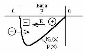 Появление поля объясняется просто. Так как концентрация основных носителей в любой точке базы (дырок n-р-n транзистора) приблизительно равна концентрации примесей в этой точке, то распределение примесей Na(х) одновременно будет и распределением дырок p(х). Под влиянием градиента концентрации дырок будет происходить их диффузионное движение к коллектору, приводящее к нарушению условия электрической нейтральности: около эмиттера будет избыток отрицательного заряда ионов акцепторов, а около коллектора - избыток положительного заряда дырок, которые приходят к коллекторному переходу, но не проходят через него.