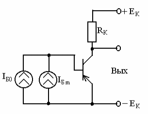 Коллекторная цепь состоит из резистора Rк и источника Ек, а цепь базы - из источников тока IБ0 и IБm Источник IБ0 обеспечивает положение исходной рабочей точке на участке характеристик с наименьшей нелинейностью. Источник IБm- источник сигнала. В качестве выходного используется переменное напряжение, выделяемое на резисторе нагрузки Rк (на коллекторе транзистора).