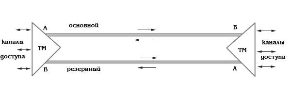 Сегмент сети, связывающий два узла A и B, или топология "точка - точка", является наиболее простым примером базовой топологии SDH сети (рис.3.6.). Она может быть реализована с помощью терминальных мультиплексоров ТМ, как по схеме без резирвирования канала приёма/передачи, так и по схеме со стопроцентным резервированием типа 1+1, использующей основной и резервный электрические или оптические агрегатные выходы (каналы приёма/передачи).